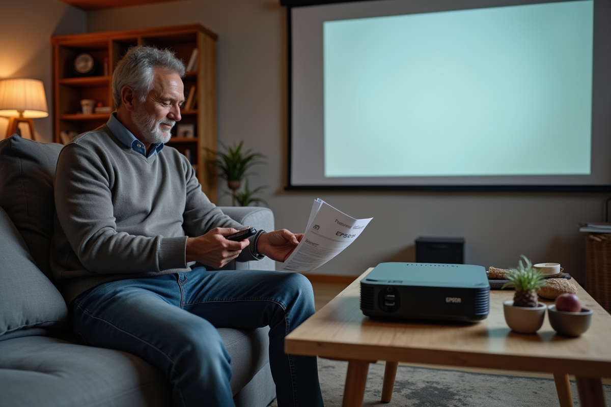 Homme en salon lisant manuel de projecteur Epson